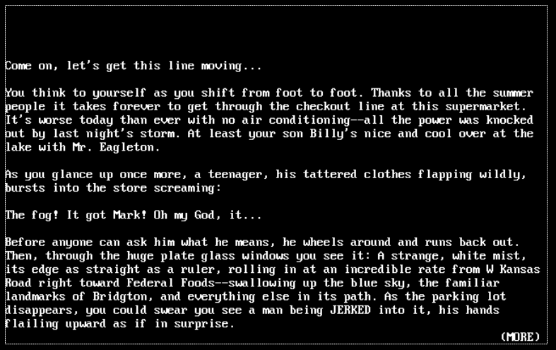 A story and text based game that hits with nostalgia or with the promise of something new isn’t automatically an amazing game, nor automatically one that everyone will enjoy. But I certainly can’t sit over here with my 1985 text game based on Stephen King’s “The Mist” and try to say that text based games heavy on story are either something new or something antithetical to the concept of games.