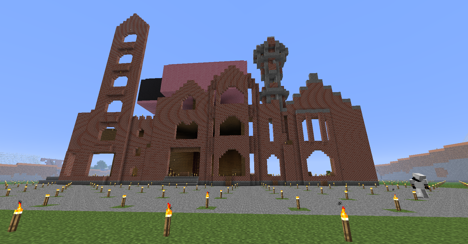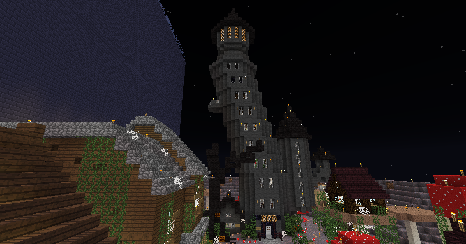 I had entirely too much fun constructing multiple buildings for part of a Halloween Challenge (37:39), all done the night before to help out a friend! The interiors left something to be desired with the short time I had, but I’m still pretty proud of how they turned out. I was also very much enjoying making my own skins by then, dressing up as Neil Gaiman’s Death for the occasion.
