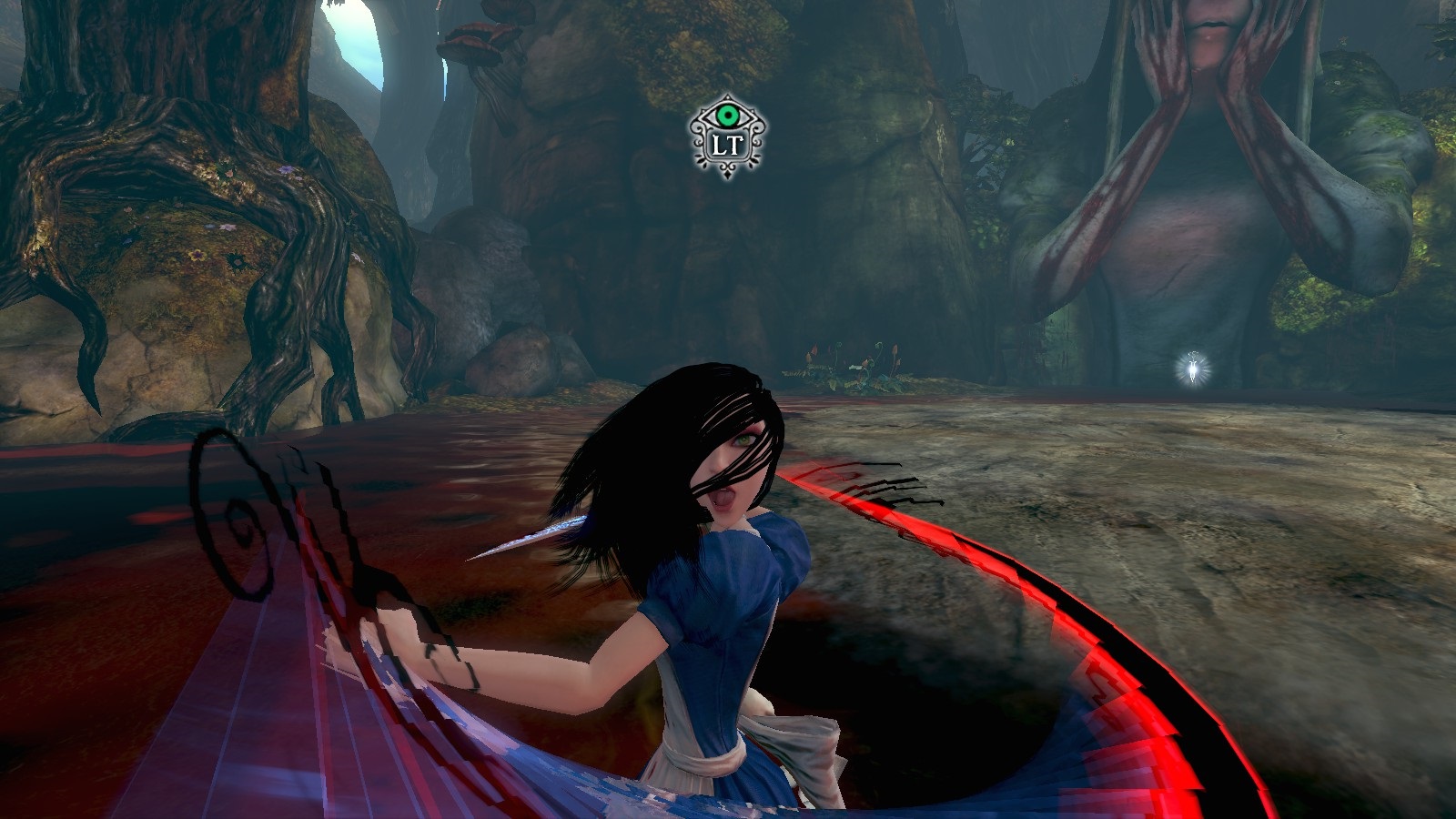 Another interesting mechanic in this game is Alice’s Shrink Sense. Early into the game, Alice gains the ability to shrink at will, allowing her to get through small doorways. This also allows you to see hidden messages, platforms, and doorways which are otherwise invisible. Though it could have gotten tiresome, the change has always been very fast for me, allowing a quick look when that’s all I need.