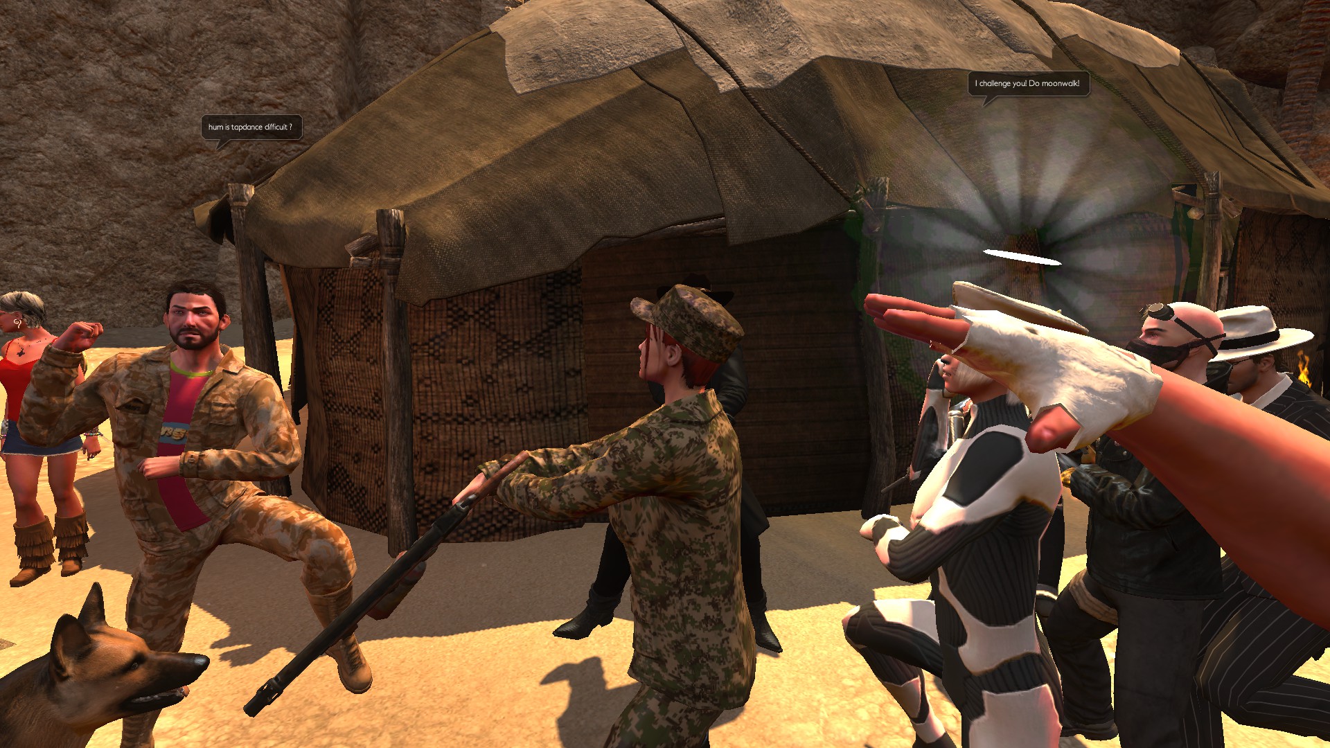 “Nassir” (being controlled by our Lead Designer, Tilty) spent the next hour and a half or so partying with us and anyone who met up in the instance. He walked us over to the “Dancing Rock” asked us to teach him new dances, and even taught us a few new ones. (We were temporarily allowed to use dance emotes that are not yet live.) He asked other guards to join (brought other NPC’s over and set them dancing) and laughed about his boss being away for the night. This was all done perfectly in character, of course!