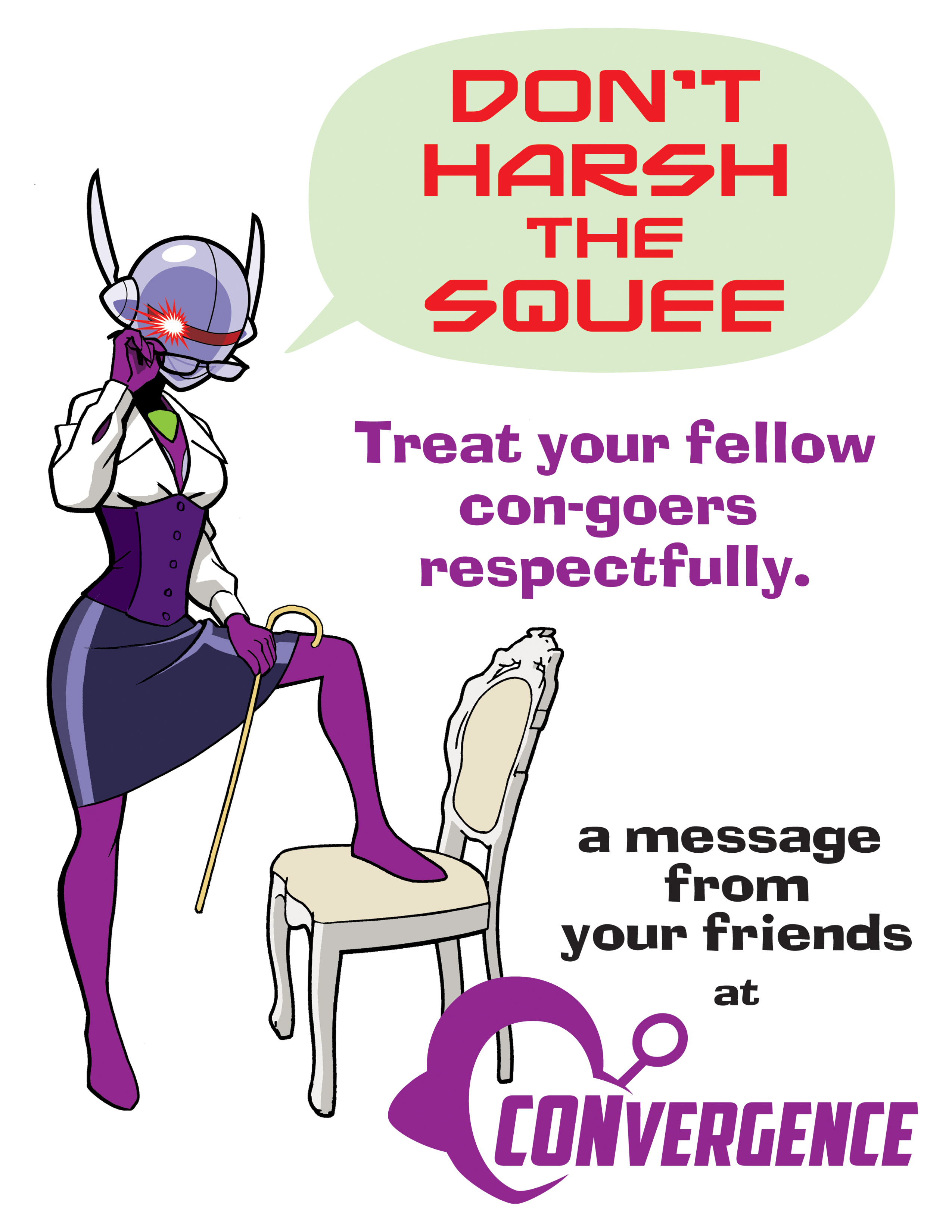 If someone tells you “no” or asks to be left alone, your interaction with them is over. Do not follow or attempt to disrupt their convention experience in any way. If you continue, against their wishes, to attempt to have contact with people who have said no or have asked that you leave them alone, you may be removed from the premises. If you wish to offer an apology to someone who asked that you not interact with them, please come to The Bridge and CONvergence Operations can assist in relaying your message.