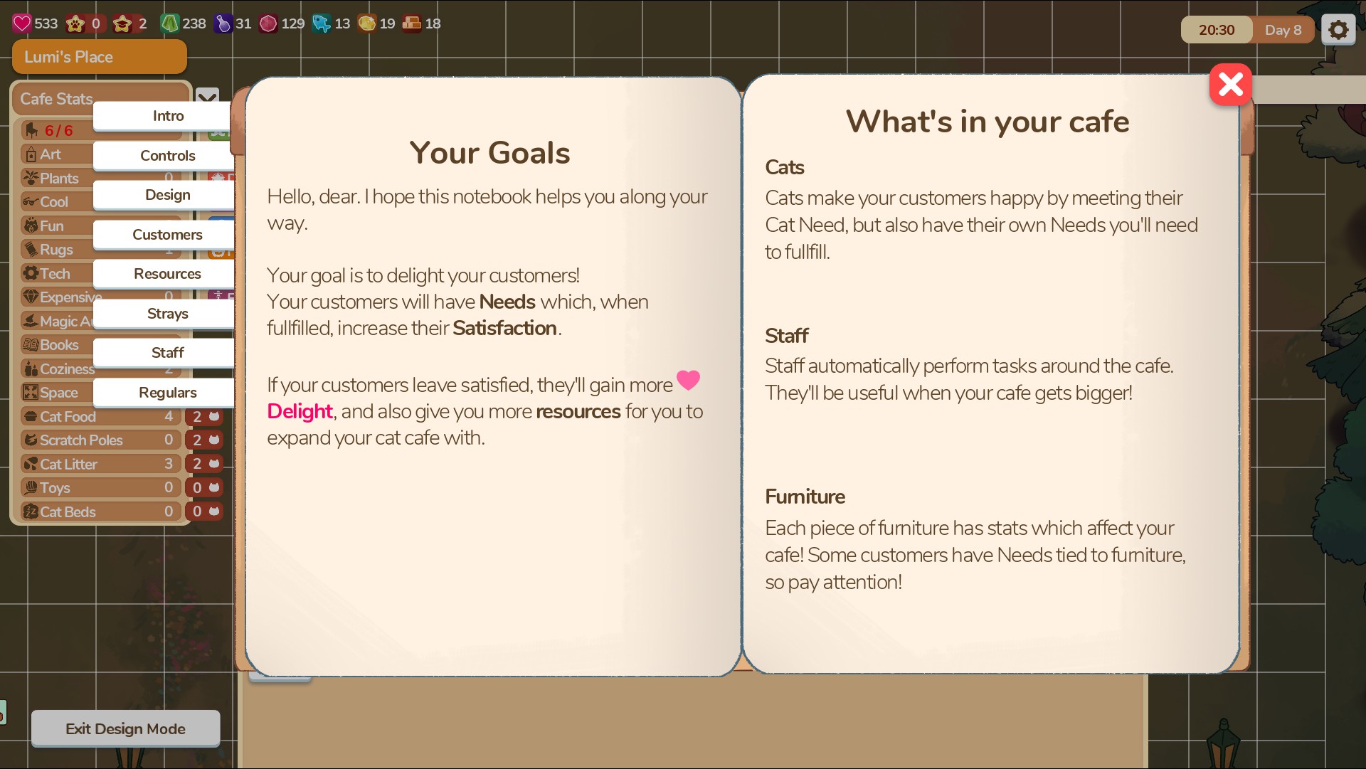 I am super digging the forgiveness in the building and design mechanic. At any time, I can go into the building screen and move some walls around to make more space or rearrange. This is SO nice, especially on a first playthrough while I’m still learning how best to place my tables, chairs, cat furniture, and cooking implements. I’ve redone my cafe multiple times and I never have to worry I’ve redone things “wrong.”